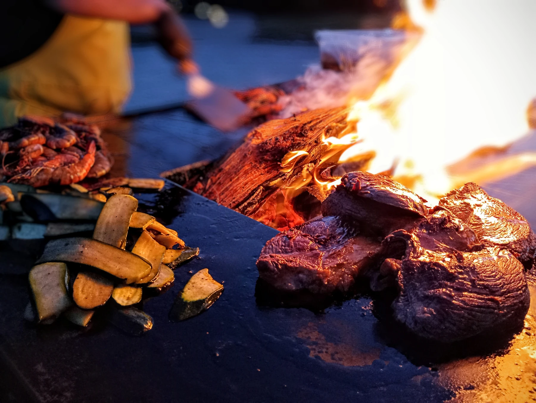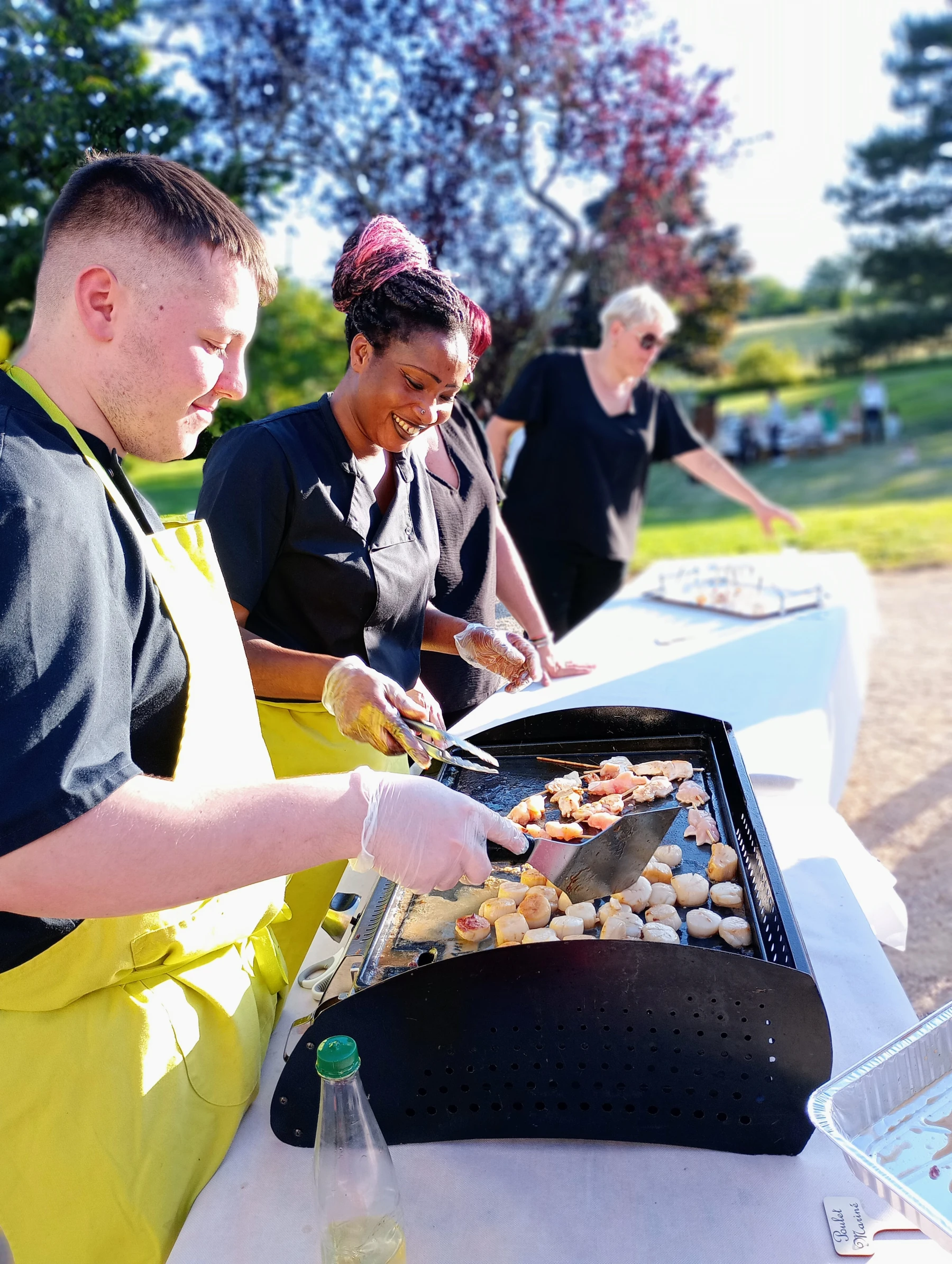 Elles ont pu ensuite profiter de la cuisson sur notre Brasero géant des pièces de Boeuf et Gambas savoureuses que nos chefs leurs ont préparés accompagnés de légumes cuits également sur le Brasero.